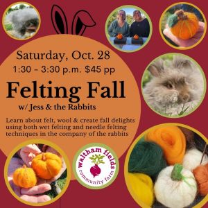 ABOUT THE PROGRAM: Learn about the history of wool and the various methods used throughout the centuries to create art and textiles that have kept humans warm, boats sailing, and homesteads warm for centuries. Meet a few members of our Angora rabbit fiber family for inspiration and cuddles, and enjoy some warm seasonally spiced tea and cookies while you create with your community! Participants will manipulate wool from their kits using the art of needle felting or wet felting to create an autumn landscape felt painting, or a 3 dimensional wool sculpture, to reflect your experience.