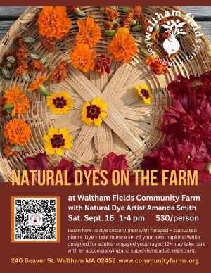 Participants will be introduced to the world of creating their own lasting colors on fabric using the natural world around us: flowers, leaves, and nuts are just some of the materials we will explore. We will take a short tour of the Farm to explore what kind of plant materials are available to forage and visit the experimental dye garden to learn about the cultivation of dye plants.